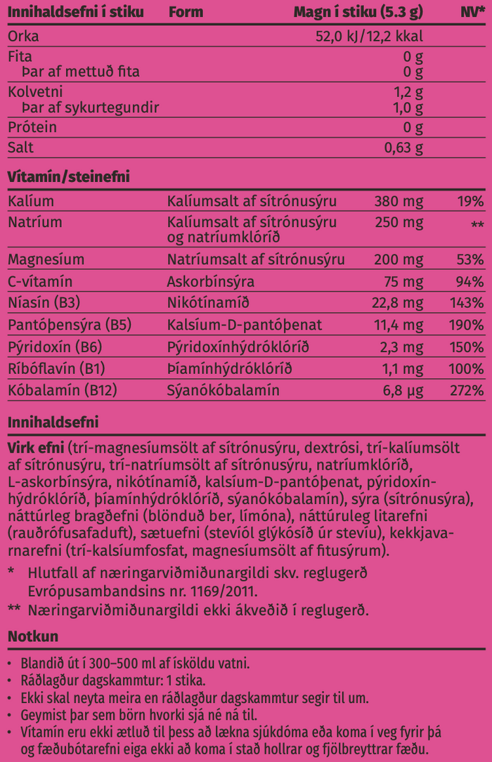Ráðlagður dagsskammtur er 1-2 stikur á dag. En það fer auðvitað eftir amstri dagsins. Ef þú missir mikinn vökva í gegnum svita t.d. á erfiðum æfingum eða í veikindum þarftu að fylla eftirfarandi á söltin sem þú tapar en ef þú ætlar umfram ráðlagðan dagsskamt bendum við á að gera það í samráði við lækninn þinn.